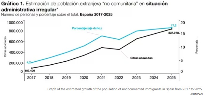 The number of irregular migrants in Spain grows by almost 700% between 2017 and 2025, from 107,000 to 840,000, according to Funcas: {Translation, summary}