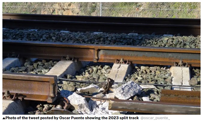 – A break detected in the high-speed track as it passes through the Espluga de Francolí (Tarragona) has forced Adif to reduce the speed of trains at 80 kilometres per hour during a section of the route, which is causing delays of up to an hour in the service. As confirmed by sources from the Ministry of Transport, the incident does not endanger the circulation of convoys and the due interventions have already been carried out on Sunday night, when it was notified. {Excuse me, it is impossible to replace sections of train rails, and test these, overnight. What type of quick fix was applied, and is it safe? -Ed.} This new incident is in addition to the reduction in the speed of AVE or Iryo trains on several sections of the route between Barcelona and Madrid, which causes the journey to take up to an hour longer than planned and has caused significant delays throughout the weekend. Source, Spanish: https://www.20minutos.es/nacional/crisis-ferroviaria-directo-una-ruptura-via-ave-barcelona-madrid-altura-tarragona-obliga-adif-reducir-velocidad-80-km-h_6925805_6.html