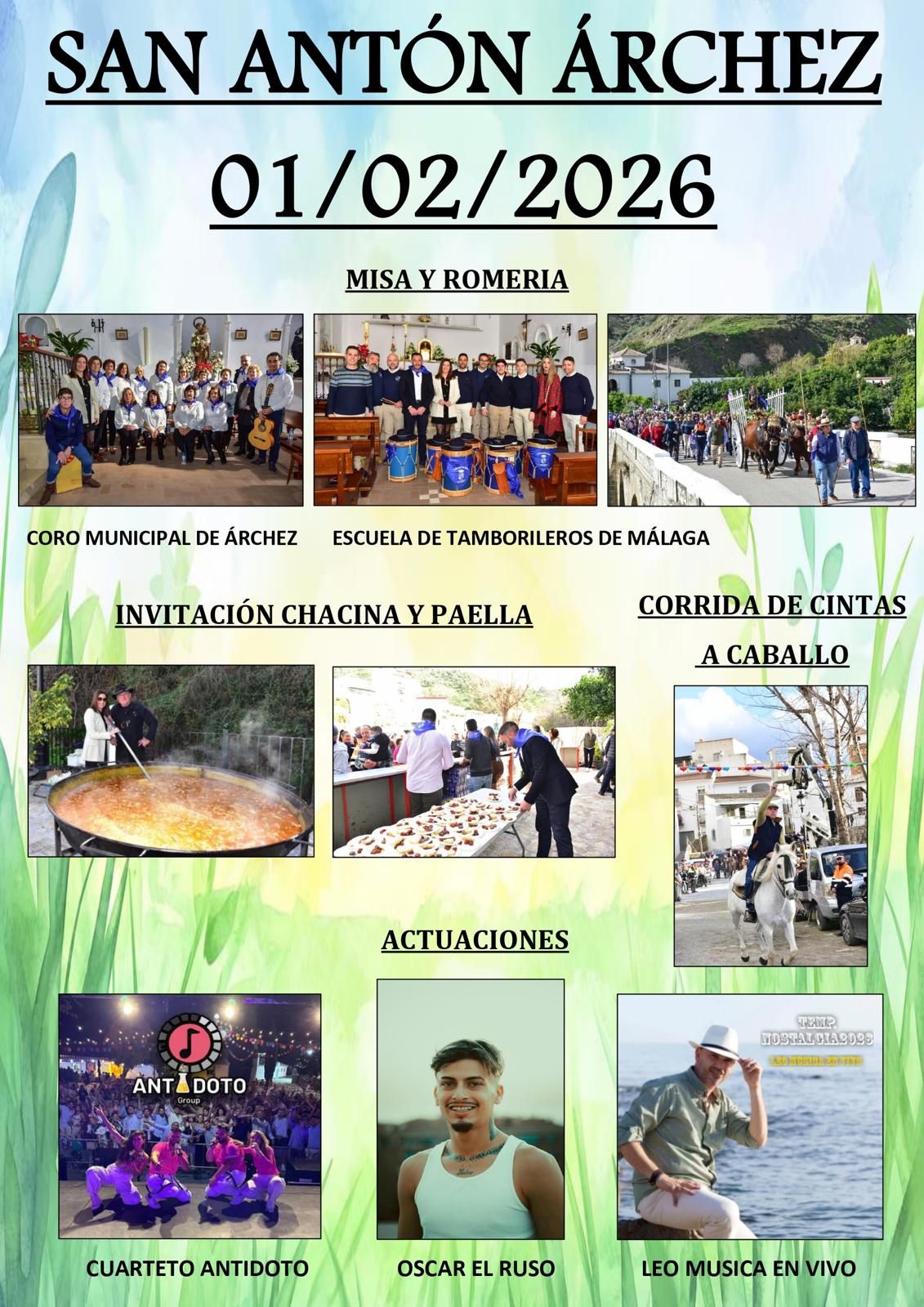 – 12:00: Rociera mass in honour of San Antón with the Municipal Choir of Árchez (Church of Nuestra Señora de la Encarnación).