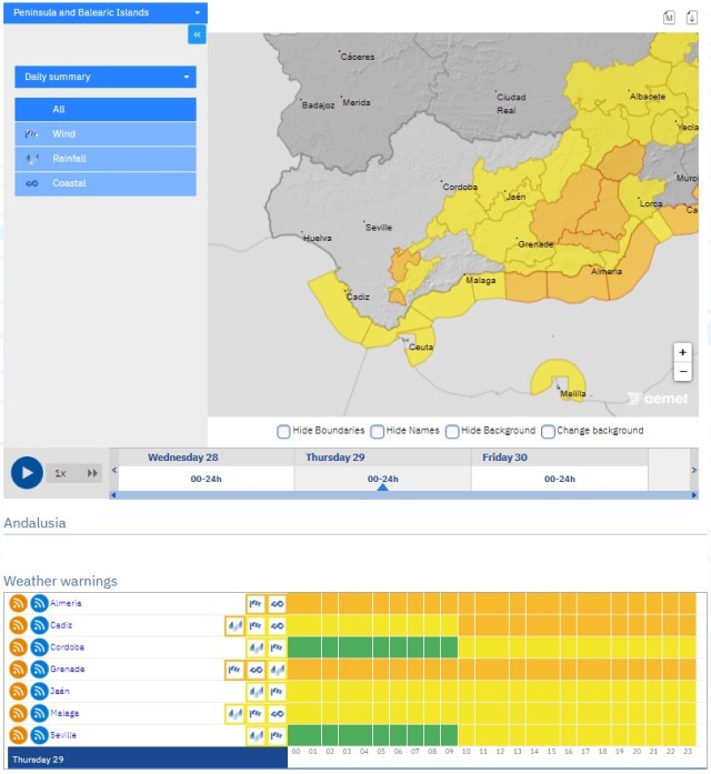 AEMET Weather Warnings In Andalucia For Thursday, 29 Jan