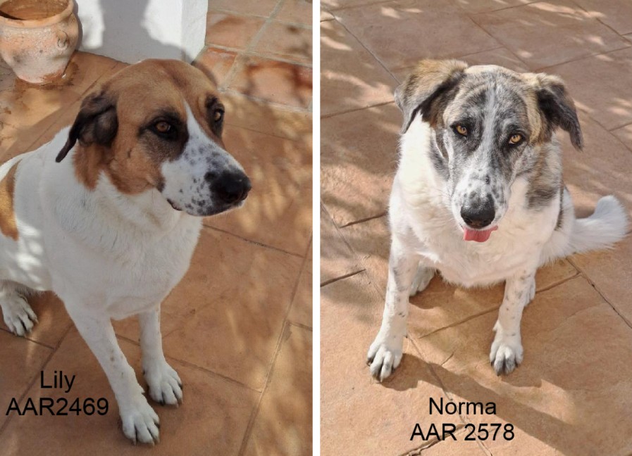 – Lily 4 yrs old & Norma 5 yrs old. Both are big girls weighing 52 & 50 kg. Sadly, due to health issues of their owners they are looking for new homes, together or separate, they get on very well together, both are good with cats and children. They love to go out for walks, but are also happy mooching around outside and lying in the sun. Fully vaccinated and neutered.