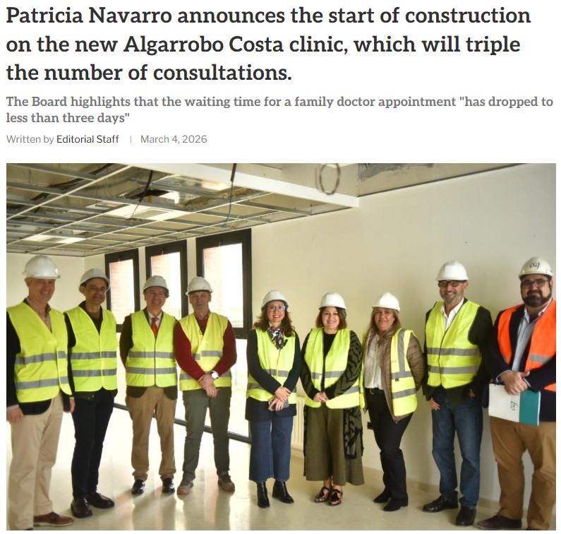 – The new facility will include nine consultation rooms: seven for doctors and nurses, a physiotherapy room, and a multi-purpose paediatric consultation room, as well as a space for social workers. The Community Social Services, run by the Málaga Provincial Council, will be located on the first floor of this building. “With this new clinic, we will triple the number of consultations compared to the current one, in addition to significantly improving accessibility for both users and professionals and expanding the range of services,” the delegate concluded. Source, Spanish: https://www.axarquiaplus.es/patricia-navarro-anuncia-el-inicio-de-las-obras-del-nuevo-consultorio-de-algarrobo-costa-que-triplicara-las-consultas/