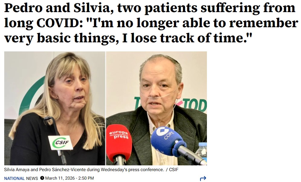 – At a press conference marking six years since the WHO pandemic declaration, long covid sufferers and the CSIF union presented survey data revealing that while 62% of over two million Spanish patients were infected at work, only a fraction have received occupational disease recognition. Patients described debilitating symptoms including extreme fatigue, brain fog, and memory loss, with over half receiving no specific treatment.