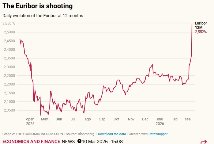 – The twelve-month Euribor has seen its sharpest daily rise since the 2008 financial crisis, reaching 2.552% due to Middle East tensions, the fourth largest increase on record. This surge impacts both daily and monthly rates, the latter being key for mortgage calculations. The last comparable rise was in June 2008, with this week’s increase at 18.5 basis points.