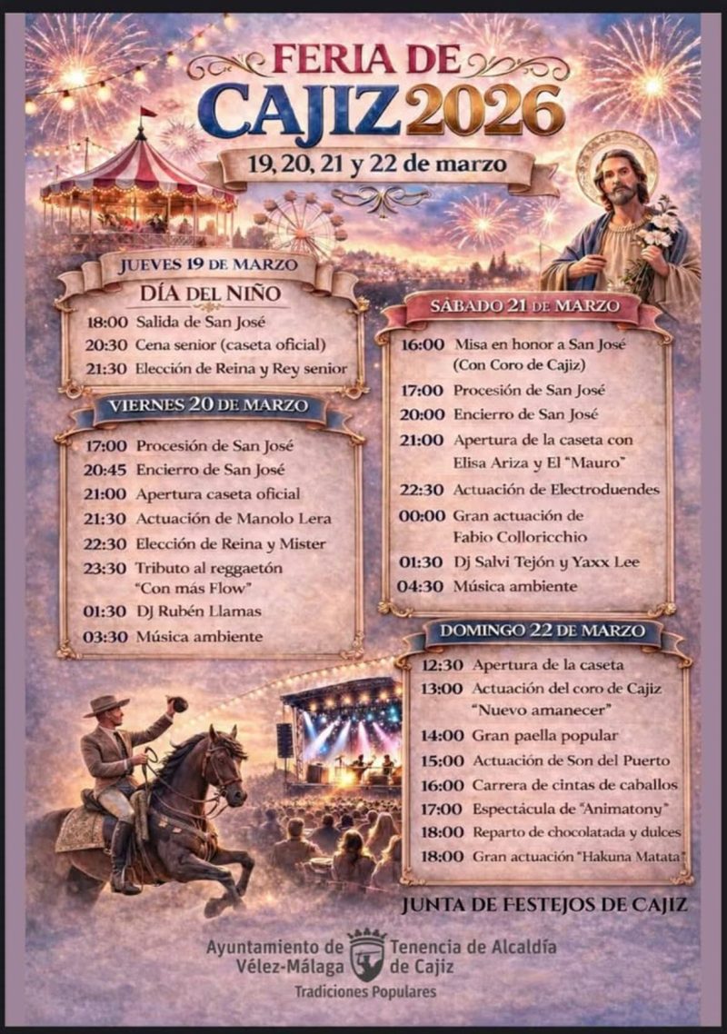 – Sunday, March 22nd. The day will begin with the opening of the fairground booth, a performance by the Cajiz choir “Nuevo Amanecer,” and a large paella for everyone. Traditional activities will also take place, such as a ribbon race on horseback , children’s shows, the distribution of chocolate and sweets, and musical performances to close the event.
