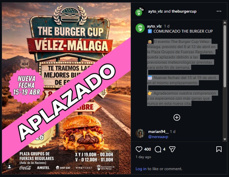 The Burger Cup Vélez-Málaga event, originally scheduled from April 8 to 12 at Plaza Grupos de Fuerzas Regulares, has been postponed due to the weather forecast for this weekend. New dates: April 15 to 19, at the same location. We appreciate your understanding and look forward to seeing you with even more excitement at this new date.
