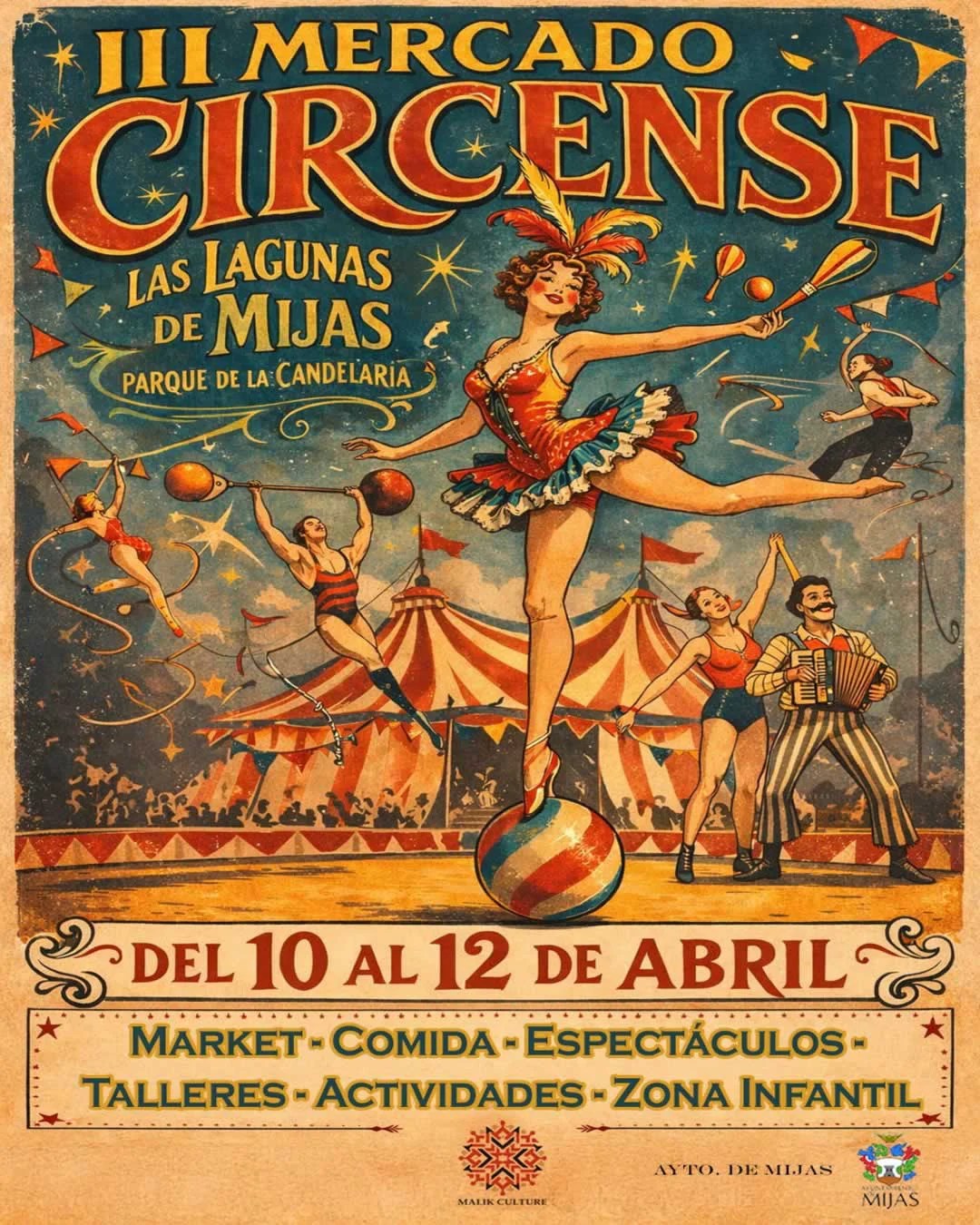 In the Parque de La Candelaria, in the town of Las Lagunas de Mijas, province of Málaga, turning this green space into a meeting point for family leisure and circus arts. What makes this event special is its circus setting. Throughout the days, there are entertainment shows with jugglers, acrobats, stilt walkers, clowns and artists who walk the streets interacting with the attendees. These performances fill the environment with music, laughter and constant surprises. The market brings together numerous stalls of crafts and varied products, where visitors can find handmade items, accessories, decoration and gastronomic proposals for all tastes. Full info & schedule: https://demercadosmedievales.es/mercado-circense/mercado-circense-en-las-lagunas-de-mijas-malaga-10-al-12-de-abril-2026/