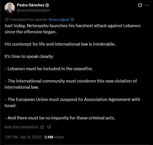 – Sánchez has criticized Netanyahu and called in a message on the social network X for there to be no impunity for these “criminal acts”, after Israeli attacks following the ceasefire agreed between the United States and Iran resulted in the death of at least 254 people and left more than 1,160 wounded. Furthermore, he called on the European Union to suspend its association agreement with Israel. “And there must be no impunity for these criminal acts,” the Prime Minister insisted. Source, Spanish: https://www.20minutos.es/nacional/sanchez-considera-intolerables-los-ataques-netanyahu-libano-tras-alto-fuego_6955798_0.html