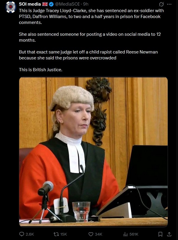 UK Injustice: This is Judge Tracey Lloyd-Clarke, she has sentenced an ex-soldier with PTSD, Daffron Williams, to two and a half years in prison for Facebook comments. She also sentenced someone for posting a video on social media to 12 months. But that exact same judge let off a child rapist called Reese Newman because she said the prisons were overcrowded This is British Justice. X Post Link