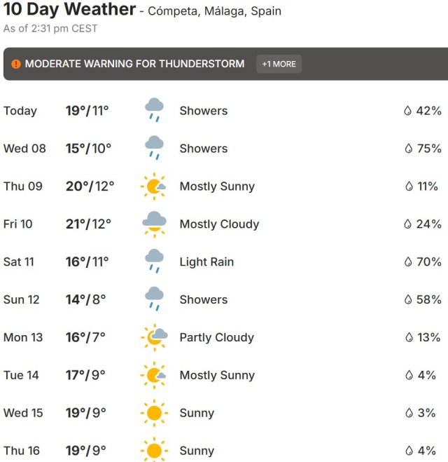 – Uncertainty is growing for the weekend, as the low-pressure system will likely interact with a new influx of cold air into the peninsula, meaning that unsettled weather and showers could continue throughout the rest of the week in different parts of the country. In short, decidedly spring-like weather, with variable skies and fluctuating temperatures. Source, Spanish: https://www.axarquiaplus.es/una-borrasca-cambia-el-tiempo-en-la-axarquia-a-partir-del-martes-con-lluvias-calima-y-probables-tormentas/
