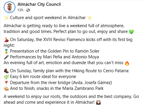 – Concerts will be held across multiple venues including the municipal swimming pool area, the main square known as the Balcon de la Axarquia, next to the historic Tahona, and other village squares. Additional activities include musical hiking, children’s workshops, camping and a zip line, creating a full day family friendly experience in contact with nature. The festival begins at 10am with the main concerts starting at 5pm and closing at 1am.Free entry, Tahona Fest aims to energise the cultural life of Comares while highlighting its natural surroundings and promoting sustainable leisure. Source, Spanish: https://www.axarquiaplus.es/comares-acoge-la-primera-edicion-de-tahona-fest-una-apuesta-por-la-musica-en-directo-y-la-diversidad-artistica-en-un-entorno-natural/