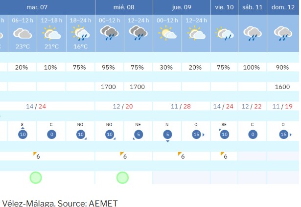 – Uncertainty is growing for the weekend, as the low-pressure system will likely interact with a new influx of cold air into the peninsula, meaning that unsettled weather and showers could continue throughout the rest of the week in different parts of the country. In short, decidedly spring-like weather, with variable skies and fluctuating temperatures. Source, Spanish: https://www.axarquiaplus.es/una-borrasca-cambia-el-tiempo-en-la-axarquia-a-partir-del-martes-con-lluvias-calima-y-probables-tormentas/