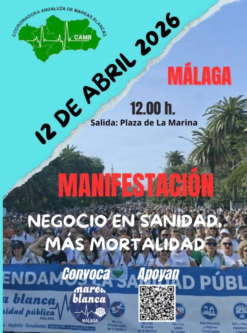 – The White Tide movement in Andalusia is calling for demonstrations to denounce the “deterioration and dismantling” of the Andalusian public health system, “driven by the current Andalusian government.” The demonstrations will take place in the capital cities of all eight provinces on Sunday, April 12. In Málaga, the protest will be held that day at 12:00 noon in Plaza de la Marina. The mobilization is being called just before the regional elections to be held on May 17.