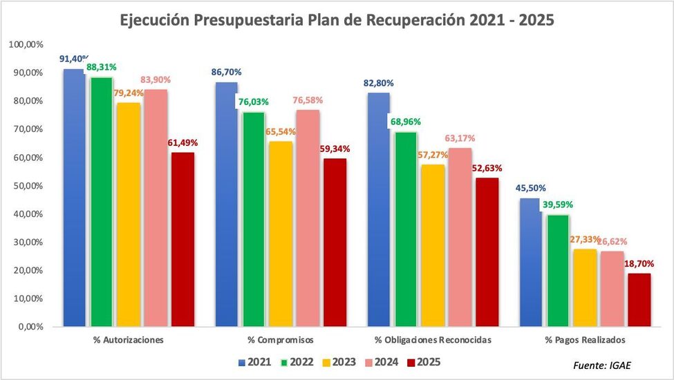– The closure of the 2025 financial year has exposed the devastating failure of Pedro Sanchez’s Government in managing the European Next Generation EU funds after five years. Spain has recorded its worst budgetary execution since the programme began, worse even than the already poor 2024 results. Authorisations, commitments, obligations and especially actual payments have all declined, with the Government achieving only 18.7 percent payment execution of the funds planned for 2025. This means the money has not reached the real economy with the required speed or efficiency, despite being the greatest modernisation opportunity Spain has had in decades.