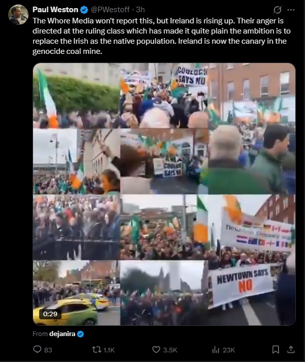 Ireland is rising up: Their anger is directed at the ruling class which has made it quite plain the ambition is to replace the Irish as the native population. Ireland is now the canary in the genocide coal mine. X Link