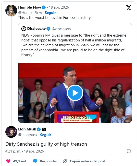– “Dirty Sánchez is guilty of high treason,” wrote Musk in a message with almost 50 million likes. It was published on the social network X, owned by Musk, in response to Sánchez’s remarks at the closing of the progressive summit ‘Global Progressive Mobilisation’ held on Saturday in Barcelona, where the Prime Minister defended the regularisation of half a million migrants promoted by his Government and rejected by the opposition. Source, Spanish: https://www.20minutos.es/internacional/elon-musk-vuelve-arremeter-contra-sanchez-le-acusa-alta-traicion-por-regularizacion-inmigrantes_6960063_0.html