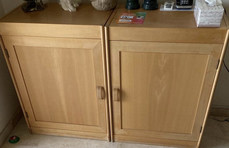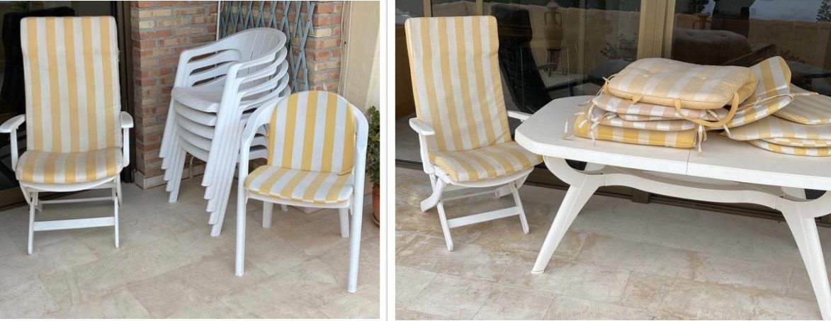 – (Reduced) Preloved folding table with pedestal base with 4 newly fabric seat cushions. Table 150 x 92 x 75cms. Price 350€