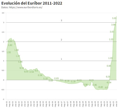 The Euribor has no brakes- it soars to 3.33% and makes variable mortgages almost 200 euros more expensive: {Translation, summary} – Bad news for mortgage holders. The one-year Euribor has closed January at its highest value since 2008, climbing to a monthly average of 3.337%, pending confirmation of the data by the Bank of Spain on Wednesday. The benchmark for most variable mortgages in Spain has accelerated its rise in the first month of 2023, so that those whose installments are reviewed in the coming days will see one of the steepest rises in recent years. – The benchmark has rebounded on Tuesday to 3.413%, the highest daily rate since 15 December 2008. This data closes the month of January, in which the Euribor has maintained its upward trend. The average for the first month of the year is almost 32 basis points higher than the 3.018% recorded in December, when the 3% barrier was crossed for the first time after the housing bubble. With this rise, the Euribor has now risen for thirteen consecutive months. Source, Spanish: https://www.20minutos.es/noticia/5097017/0/el-euribor-continua-su-tendencia-al-alza-la-media-de-enero-se-situa-en-el-3-337-y-eleva-la-cuota-de-las-hipotecas-variables-casi-300-euros/