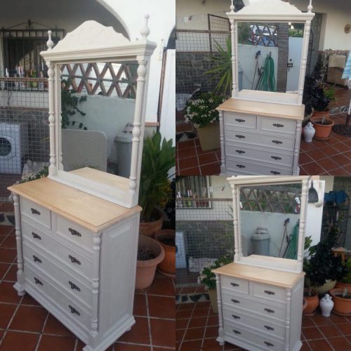 Great Deals From The Nerja Household Centre: – Chest of drawers solid natural wooden top done in a verde Olivia 110 x 56 x 80cms Price 170€ – Verde Olivia painted mirror 49 x 43cms Price 25€ – Beige castillan mirror 67 x 50cms Price 45€ contact Jackie/nerja 672170429 info at nerja household centre dot com