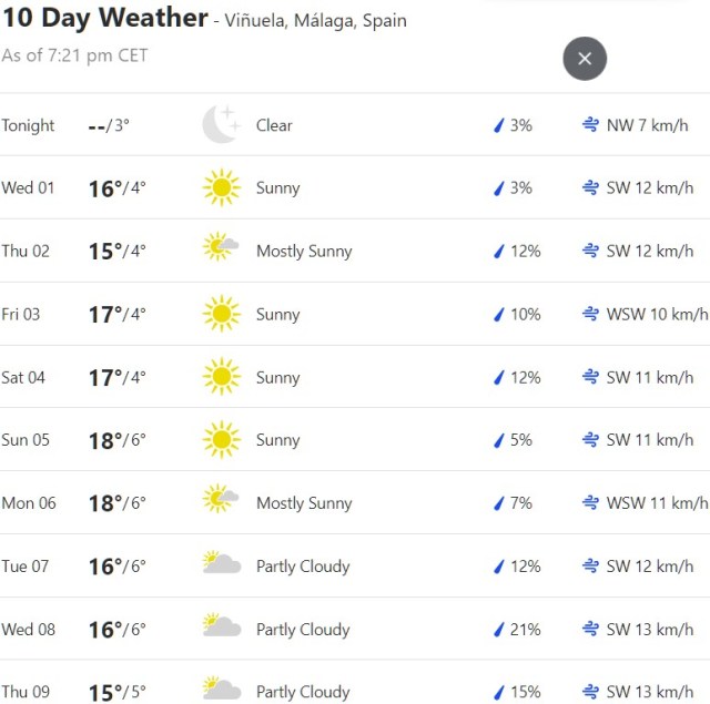 Will polar cold return this week?: {Translation, summary} Sunday, February 5, 2023, 12:47 – The temperatures during the weekend have shown a slight increase, alleviating somewhat the polar cold of the last week. Although the night frosts have remained in a good part of the country, during the day the values have been relatively pleasant for this time. But, according to the weather forecast from the State Meteorological Agency, the situation is going to change for next week. – Specifically in Malaga, Aemet already foresees a high possibility of rain from Tuesday, but mainly on Wednesday, the day of the week in which the percentage is between 90 and 100% in practically the entire province, although with less intensity in the Axarquia. The precipitations could be maintained during Thursday and decrease towards the weekend, although everything will depend on the evolution of the dana. – Regarding temperatures, in the capital, Axarquía and Valle del Guadalorce, Meteorology forecasts maximums that will oscillate between 15 and 18ºC; on the Costa del Sol, between 17 and 19ºC, and in the Serranía de Ronda, between 9 and 14ºC. Only in some inland municipalities are the maximum temperatures expected to drop below 10ºC. Source, Spanish: https://www.diariosur.es/malaga/prediccion-tiempo-proxima-semana-frio-polar-lluvias-20230205121124-nt.html
