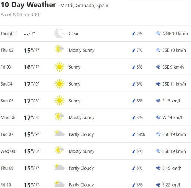 What weather can we expect in the south of Spain for the rest of this week?: – The low temperatures will continue to be felt across this week in Andalucía, especially on Thursday, due to the location of an anticyclone that will cause a mass of cold and dry air to enter the Spanish mainland that will leave maximum values of between eight and 15 degrees Celsius, and minimums that will be below zero degrees in some parts of the region. – Looking ahead to Friday and Saturday, the weather expert indicated that “little cloudiness is expected” but on Sunday “there could be an increase, with the probability of showers on the Mediterranean coast.” As for the maximum temperatures, they will be relatively low for this time of year both inland and in the Mediterranean coast areas, but “they will not be exceptional”. Full article: https://www.surinenglish.com/andalucia/what-will-weather-be-20230124084927-nt.html